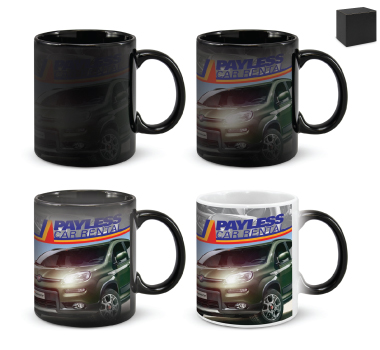 These round 300mL mugs are something a little different from your typical mug. They have a unique thermochromic coating which allows the dishwasher safe wrap around branding to appear once hot liquid is added and then disappear again when it cools. These all come presented in a black gift box. Please note: we recommend you hand wash these mugs.